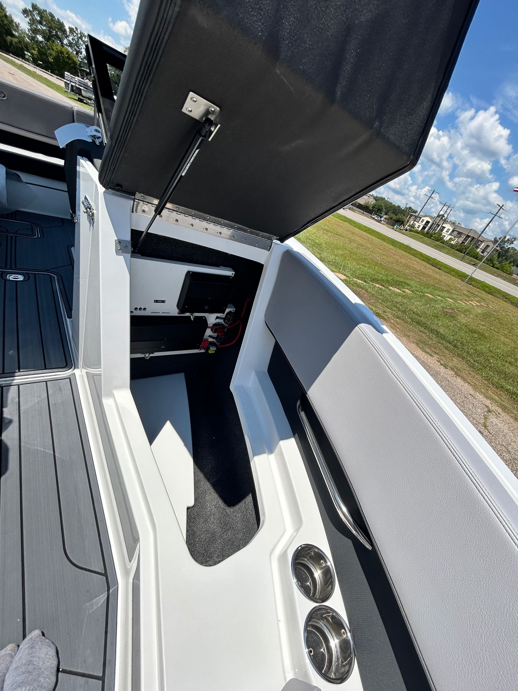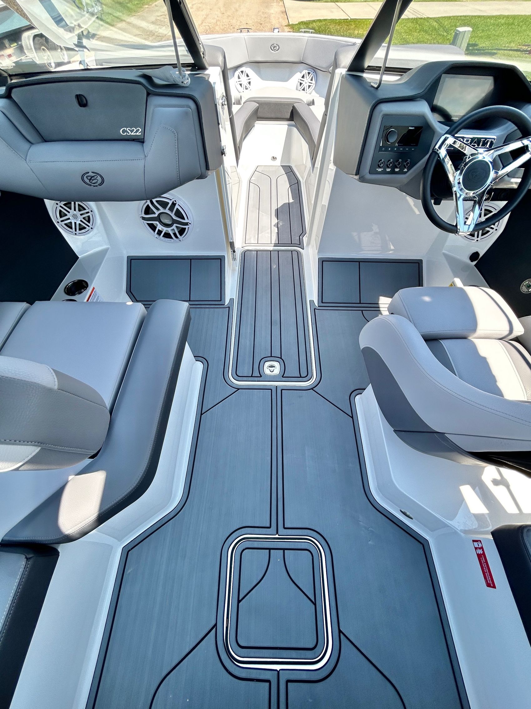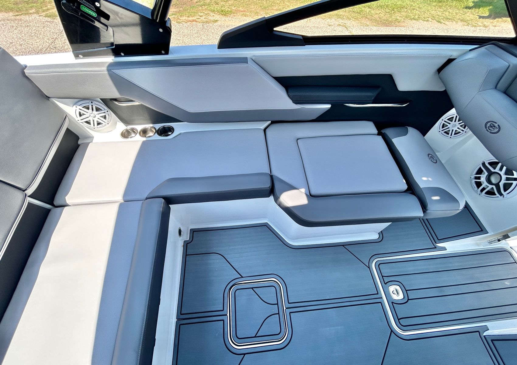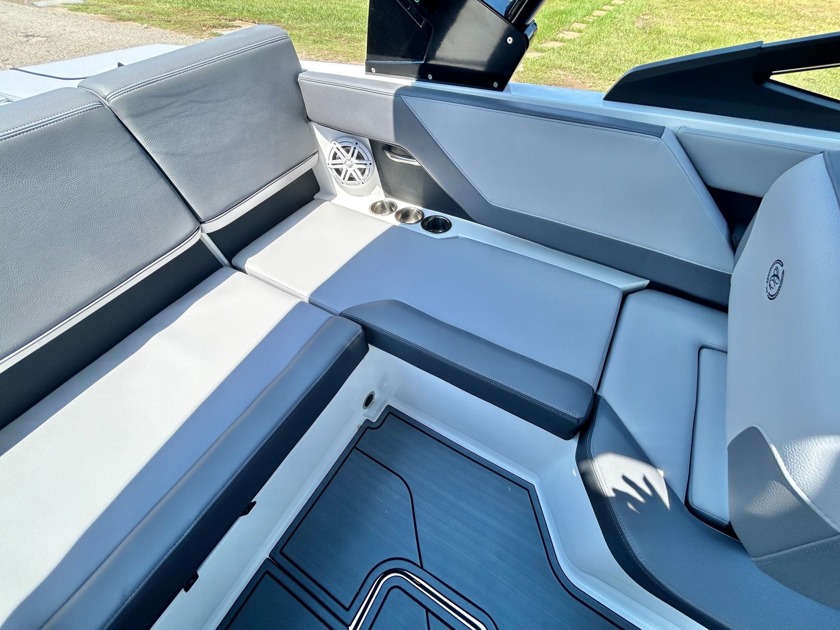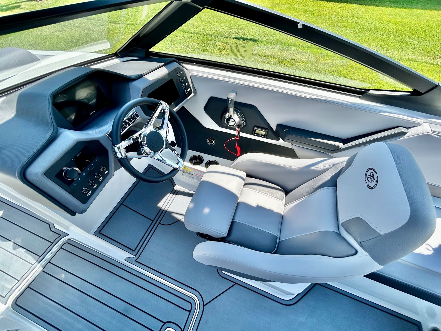 Added Features: SOF-TRAC Mat Flooring (Grey/Ebony), Fire Extinguisher (STD), Custom Mooring Cover, LED Interior Accent Lighting (R/G/B), Battery Charger and 10/5/3 Year Warranty Protection