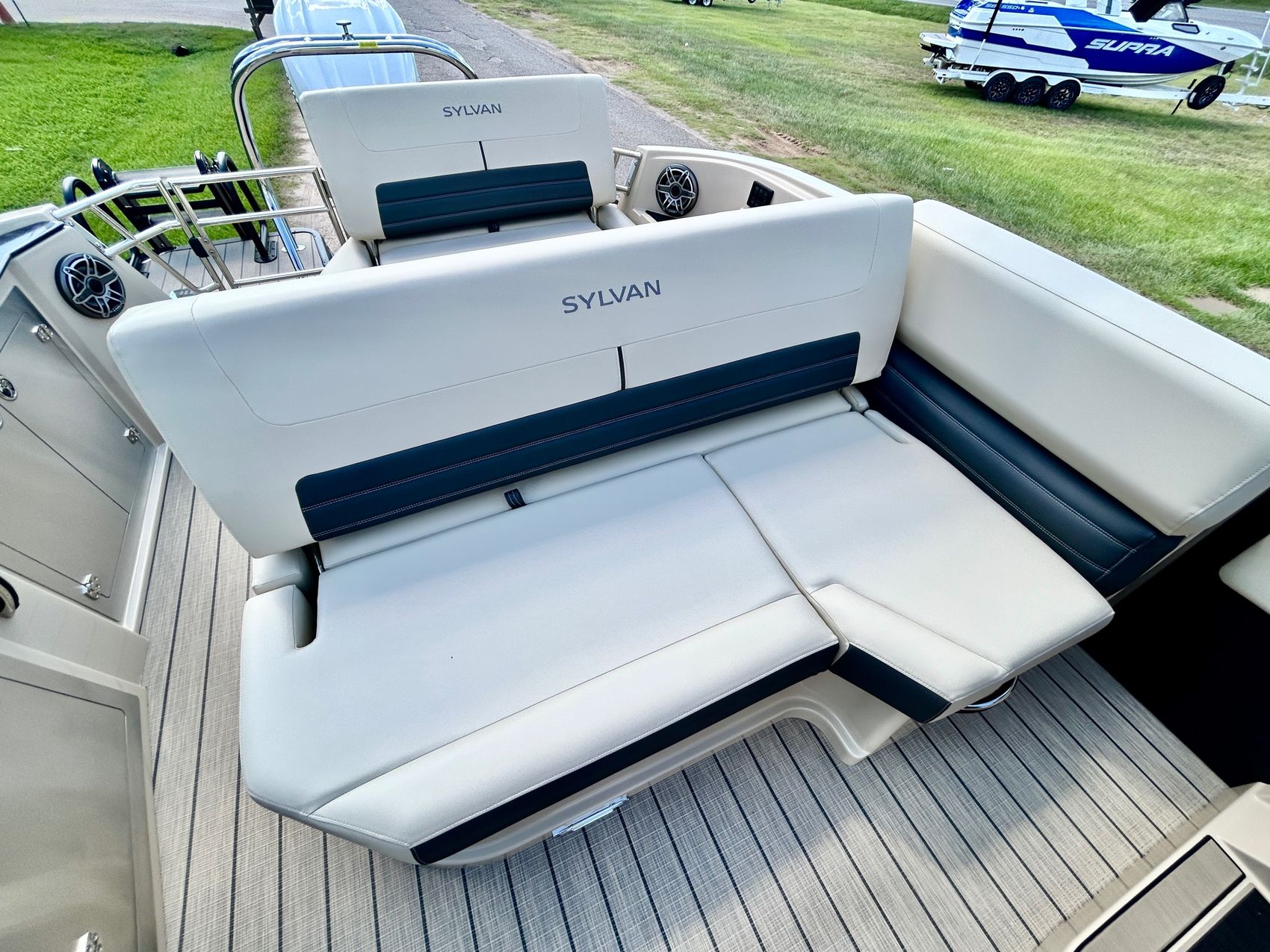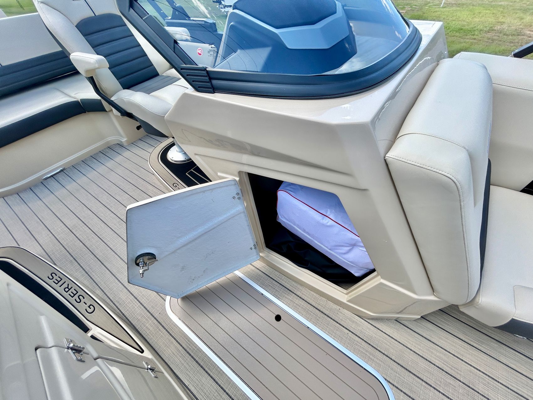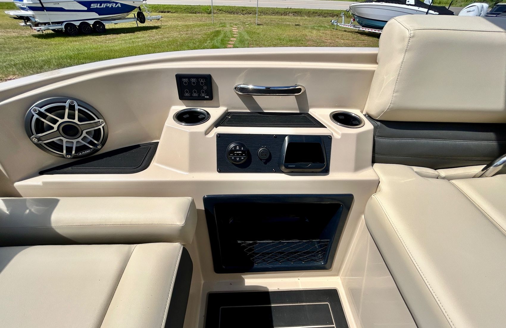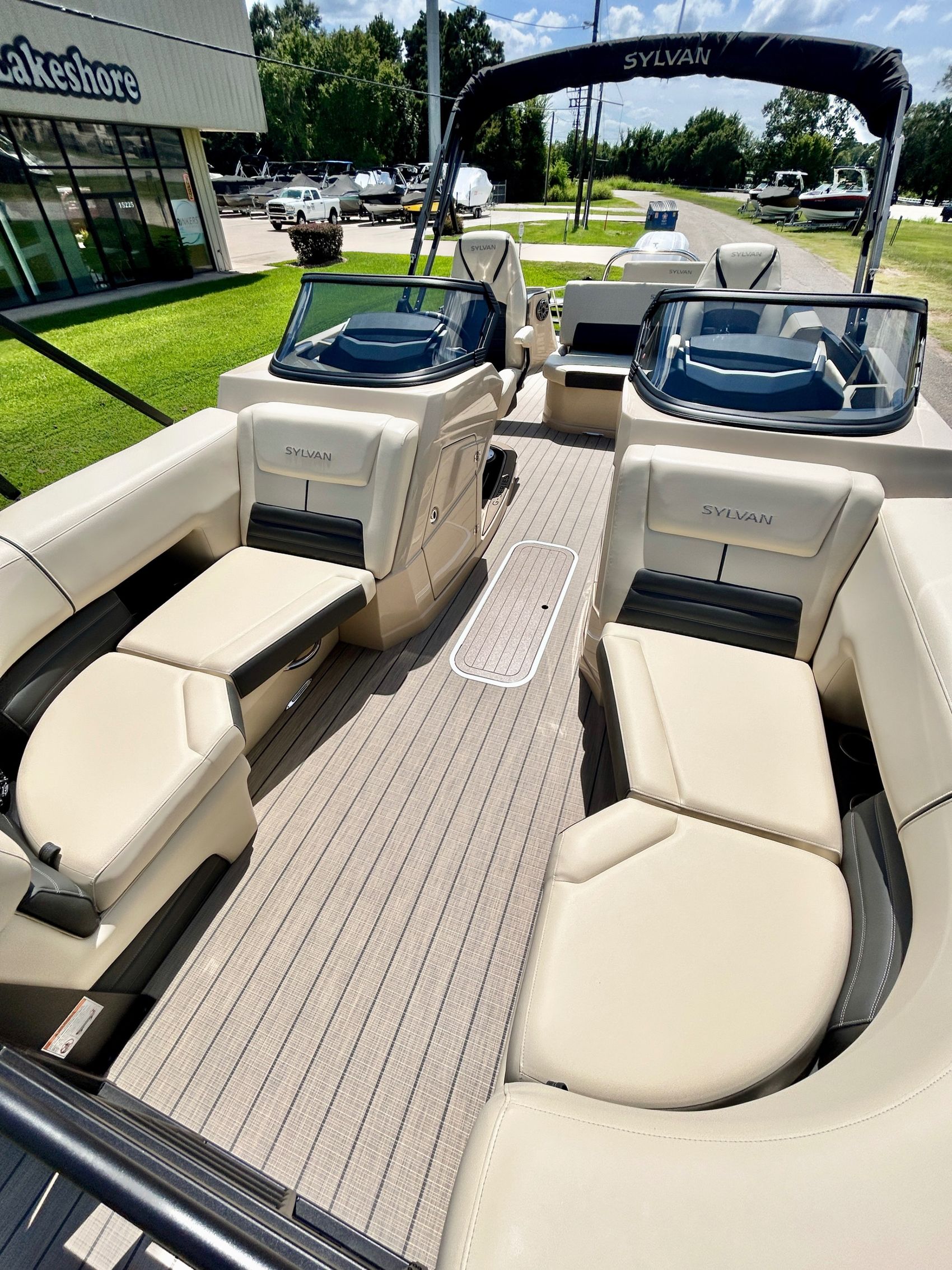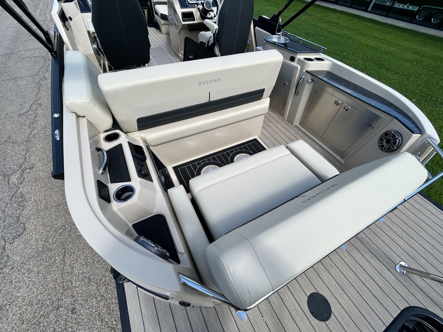 ADDED FEATURES: In-floor Storage, Black Tubes, Battery Charger, Dual Batteries, Custom Cover, Teak Weave Flooring (Tan),Two Bimini Tops (Rear is Powered), Interior Mood Lights (RGB), Furniture Cupholders Lighted (RGB), Underwater Lights & Underdeck Lights (RGB), Deluxe Ski Tow, Dual Glass Windshields, Dual Raised Consoles, Extended Back Deck, Upgraded REVO Black Ladder, Rear Facing Speakers, Ultra Premium Sound Package—Stern Remote