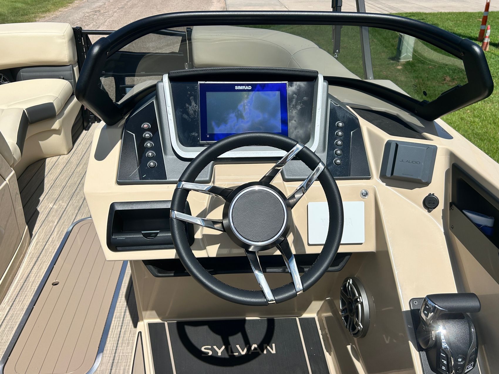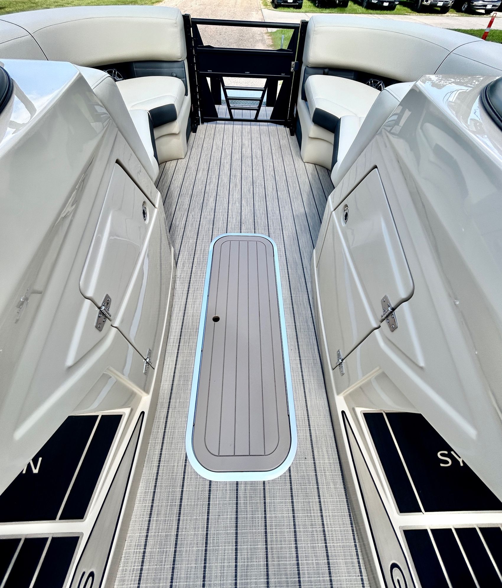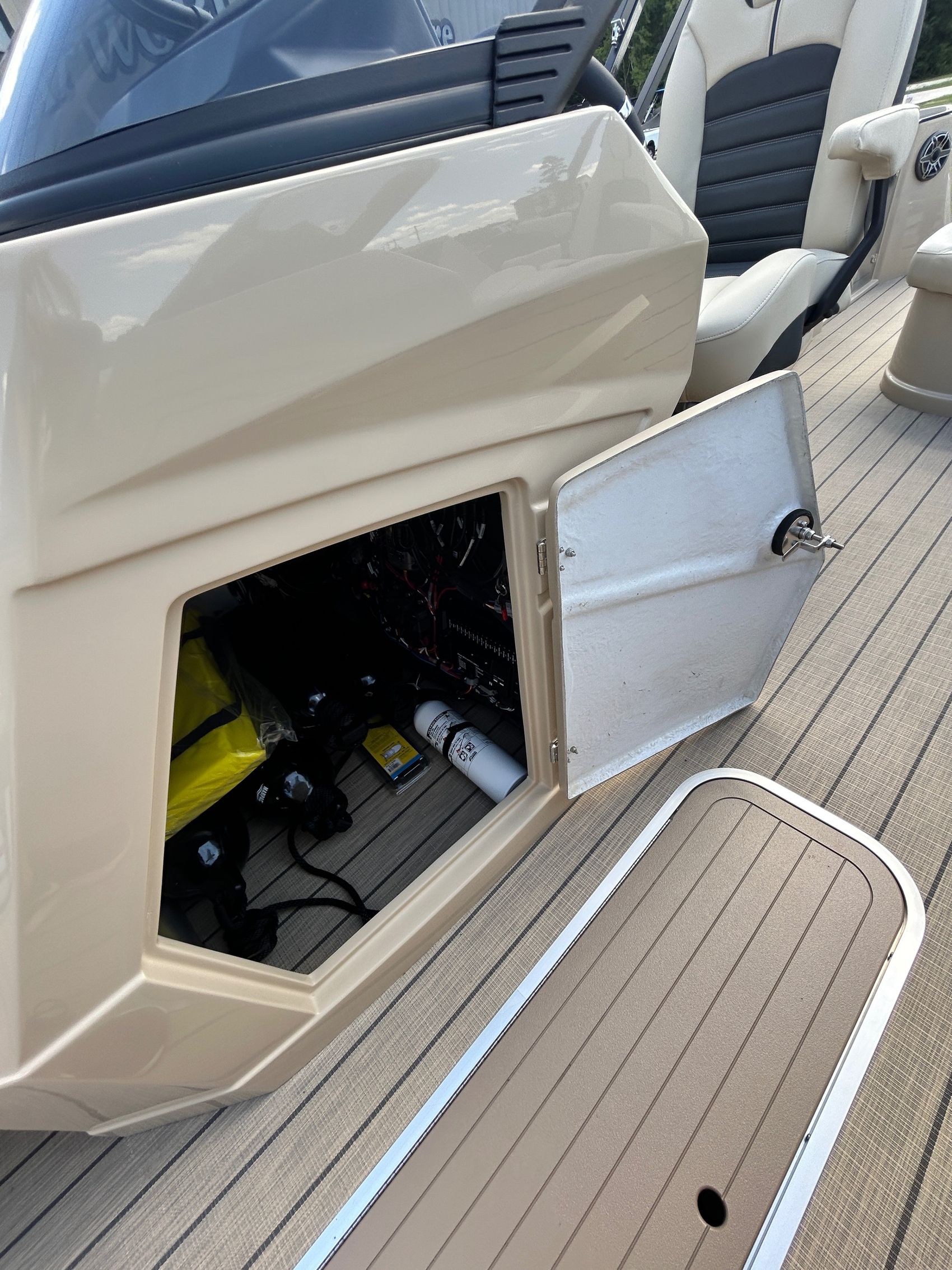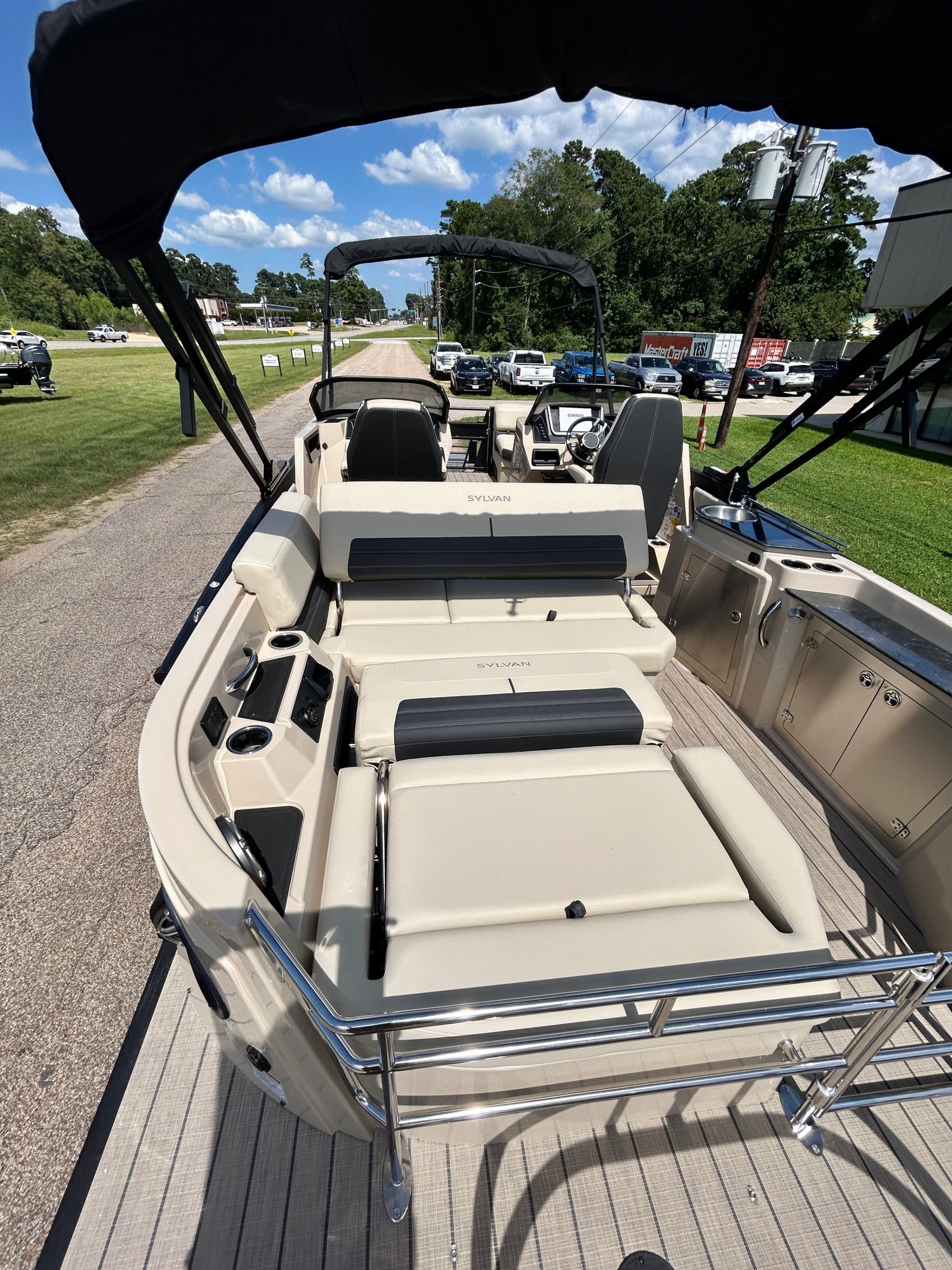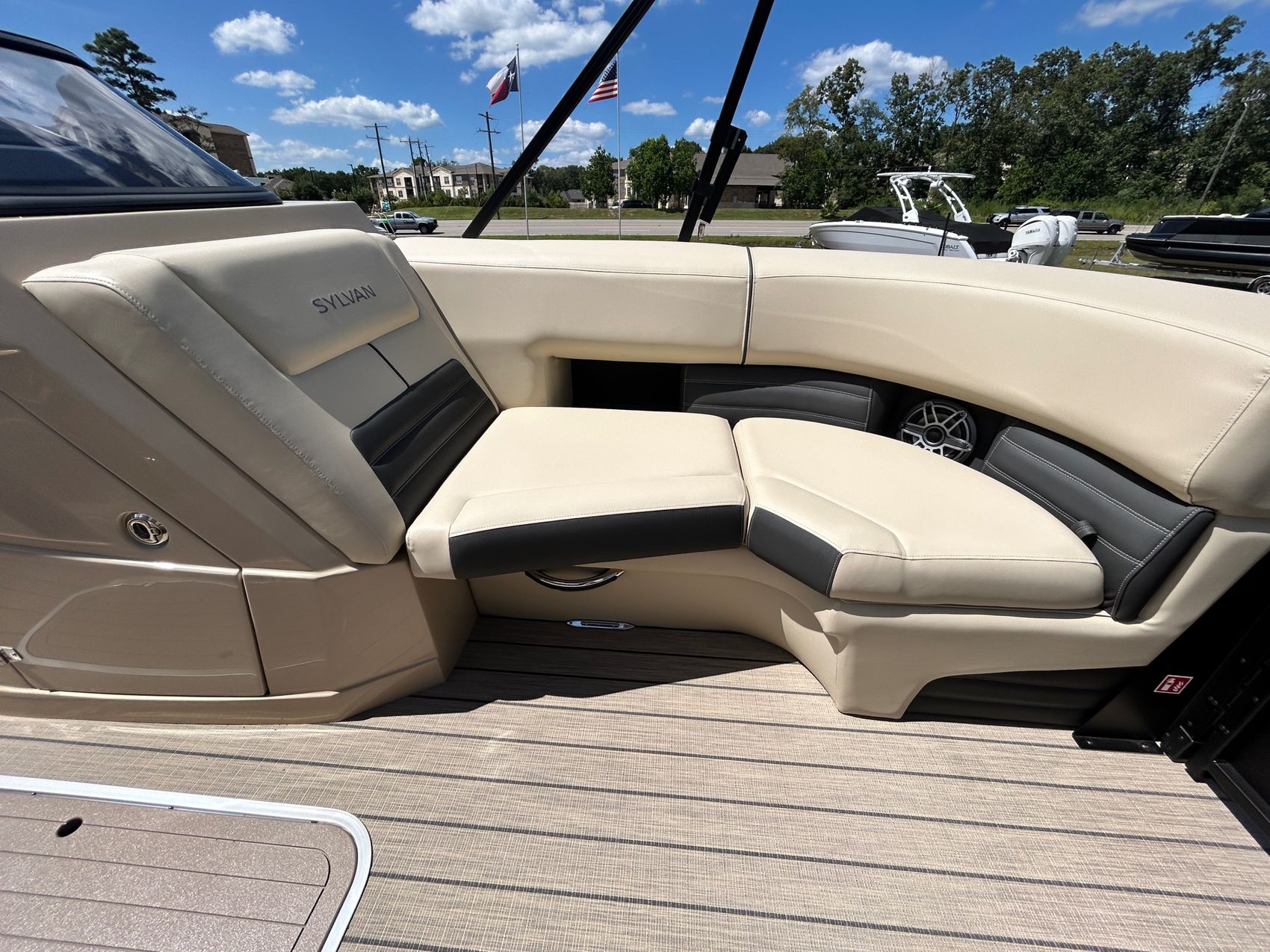 ADDED FEATURES: In-floor Storage, Black Tubes, Battery Charger, Dual Batteries, Custom Cover, Teak Weave Flooring (Tan),Two Bimini Tops (Rear is Powered), Interior Mood Lights (RGB), Furniture Cupholders Lighted (RGB), Underwater Lights & Underdeck Lights (RGB), Deluxe Ski Tow, Dual Glass Windshields, Dual Raised Consoles, Extended Back Deck, Upgraded REVO Black Ladder, Rear Facing Speakers, Ultra Premium Sound Package—Stern Remote