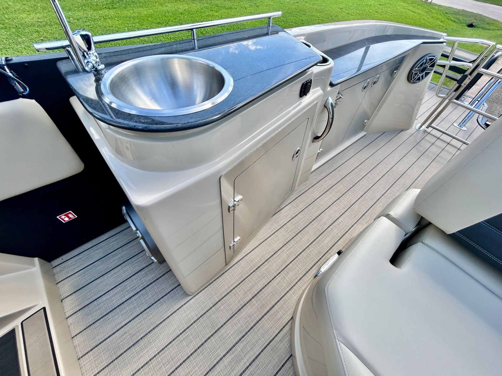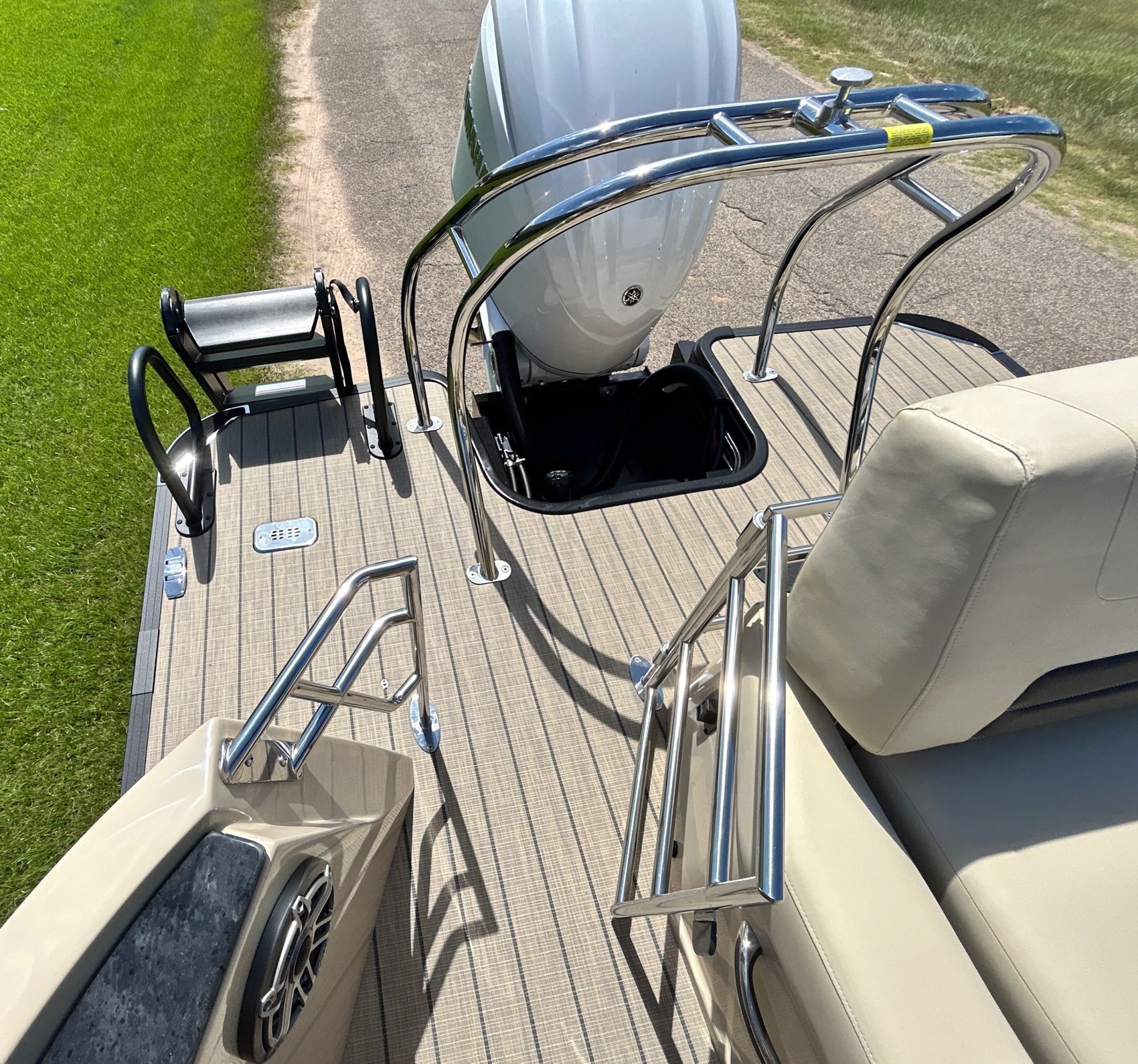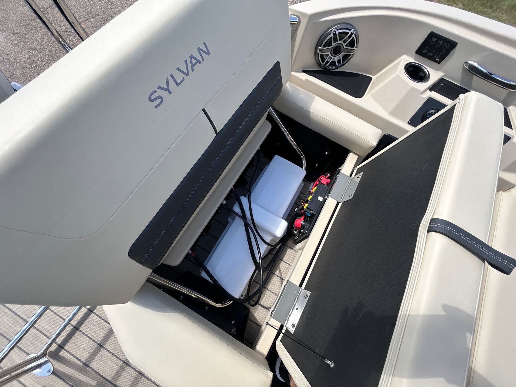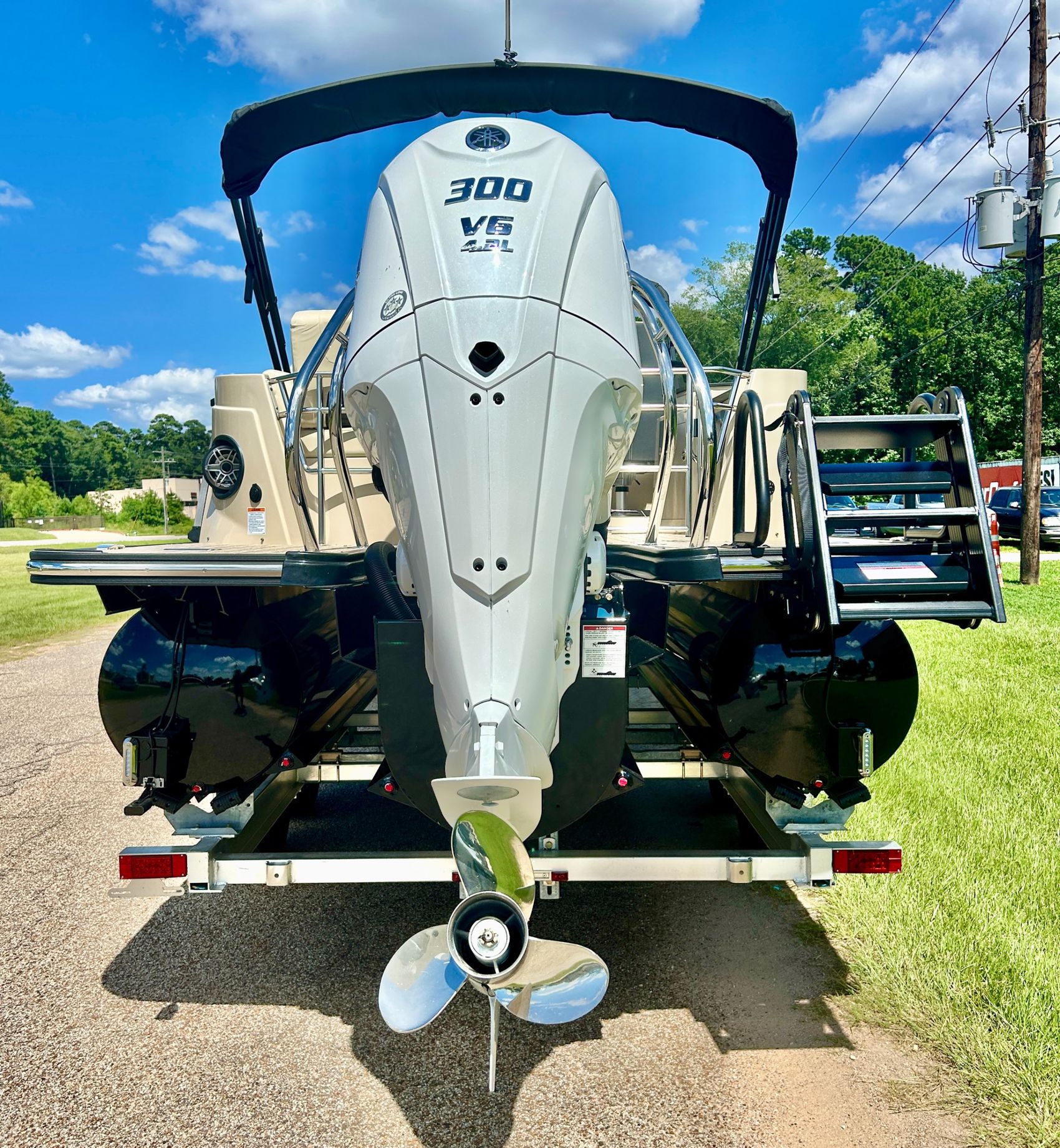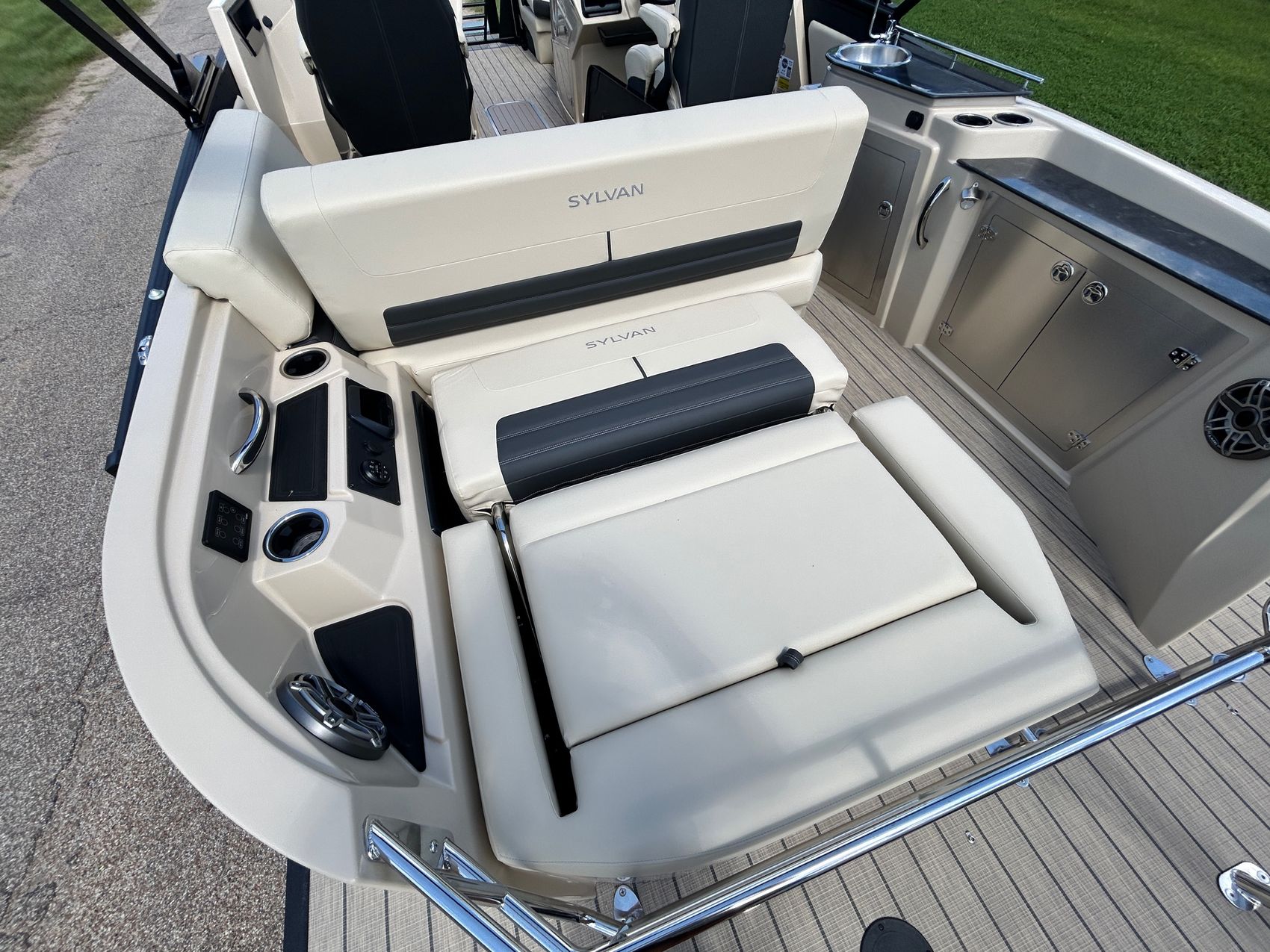 ADDED FEATURES: In-floor Storage, Black Tubes, Battery Charger, Dual Batteries, Custom Cover, Teak Weave Flooring (Tan),Two Bimini Tops (Rear is Powered), Interior Mood Lights (RGB), Furniture Cupholders Lighted (RGB), Underwater Lights & Underdeck Lights (RGB), Deluxe Ski Tow, Dual Glass Windshields, Dual Raised Consoles, Extended Back Deck, Upgraded REVO Black Ladder, Rear Facing Speakers, Ultra Premium Sound Package—Stern Remote