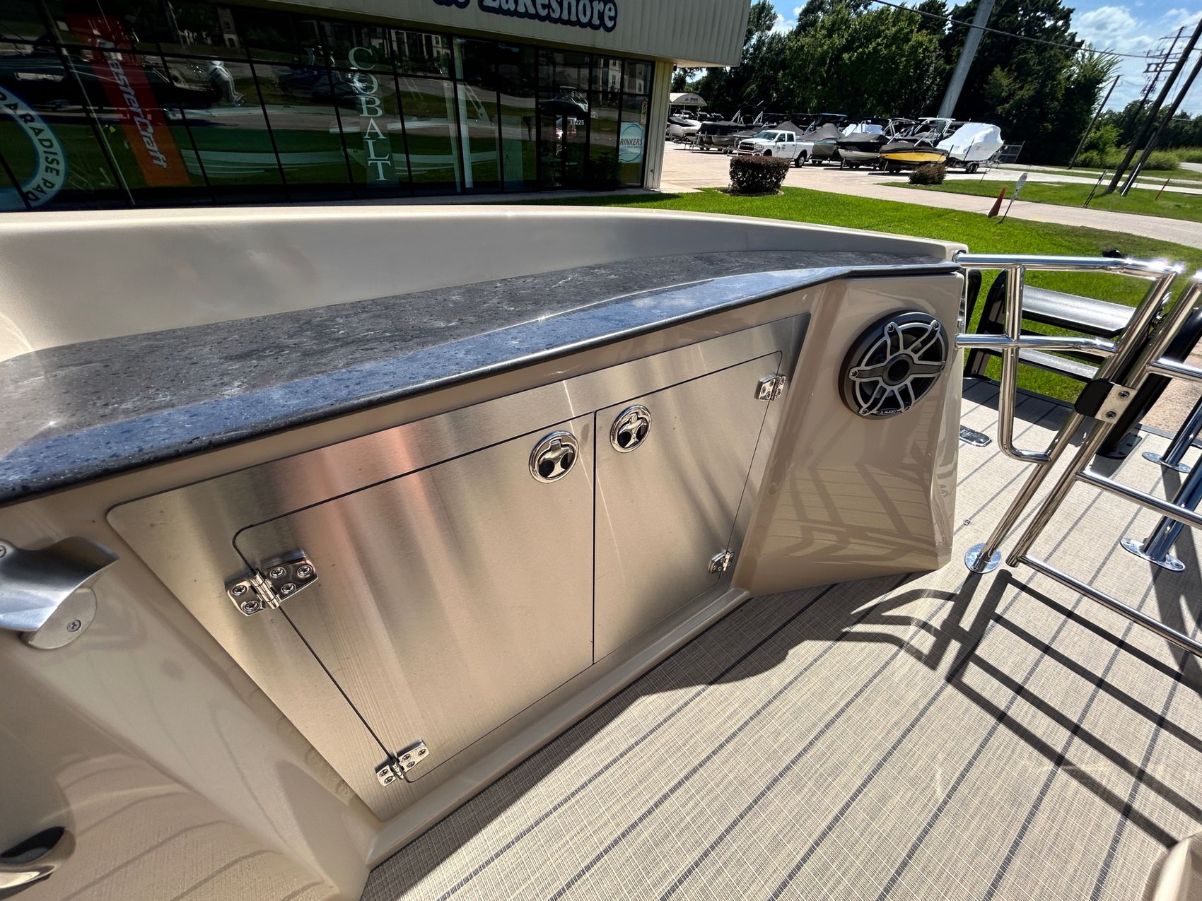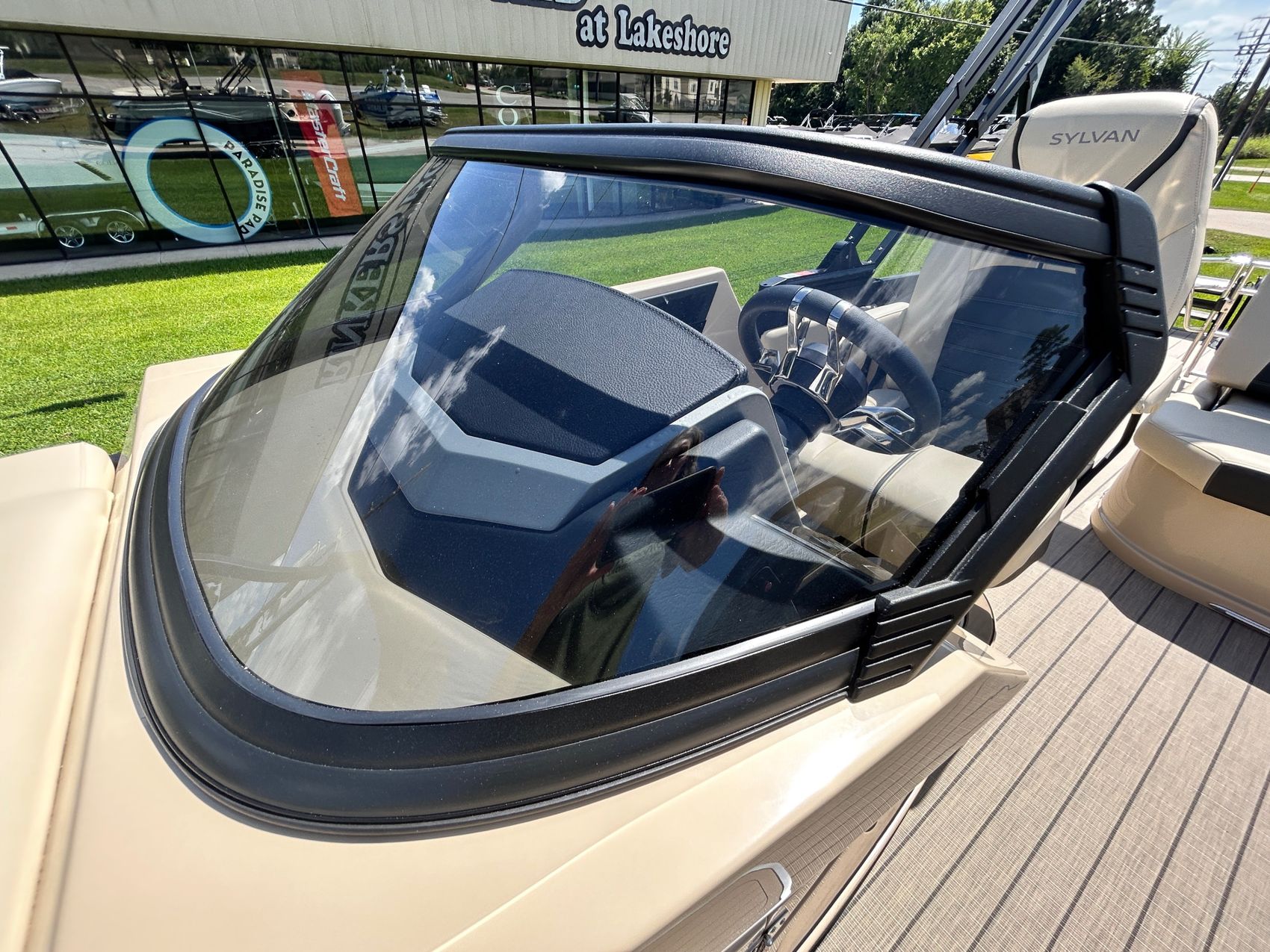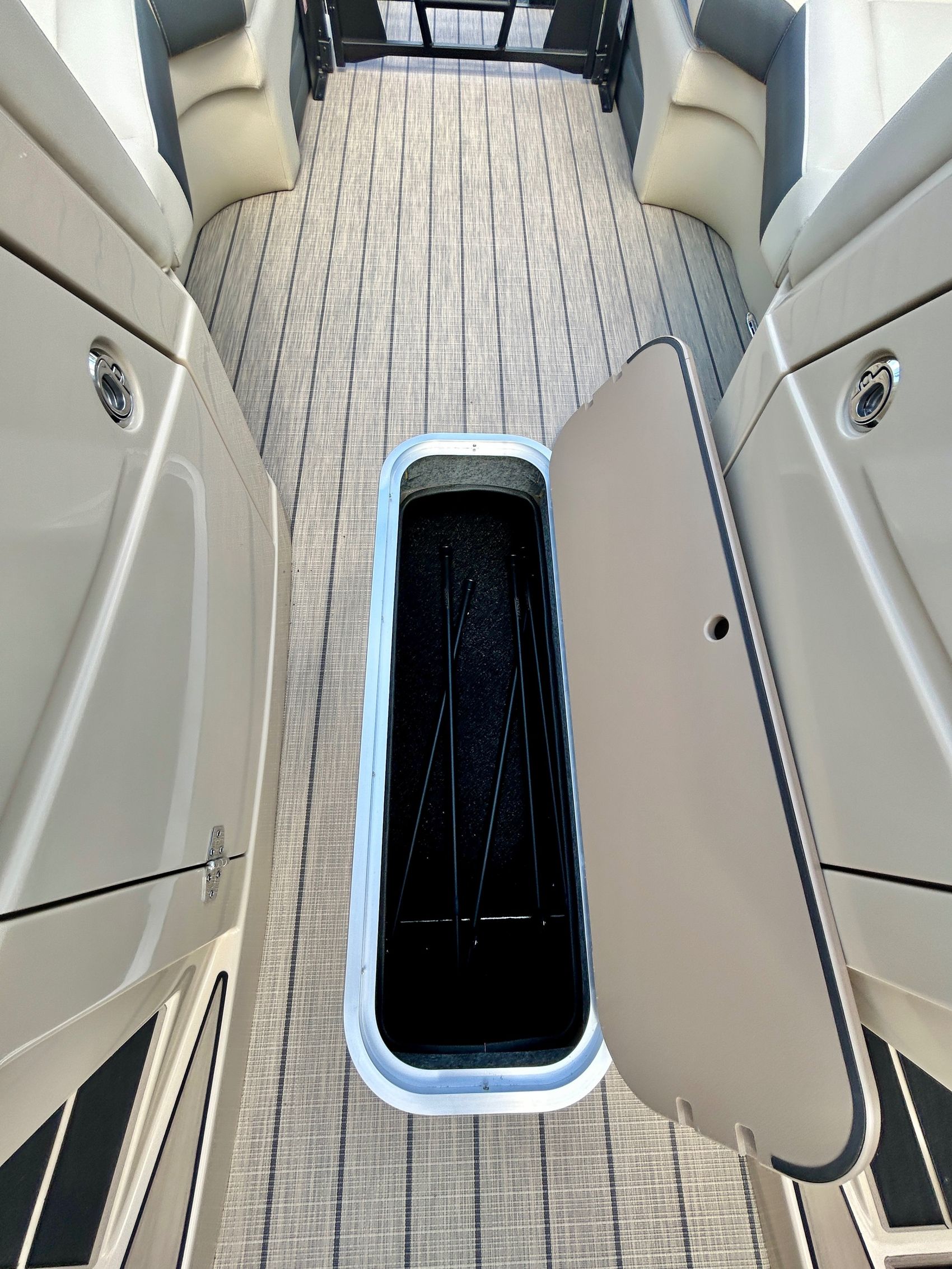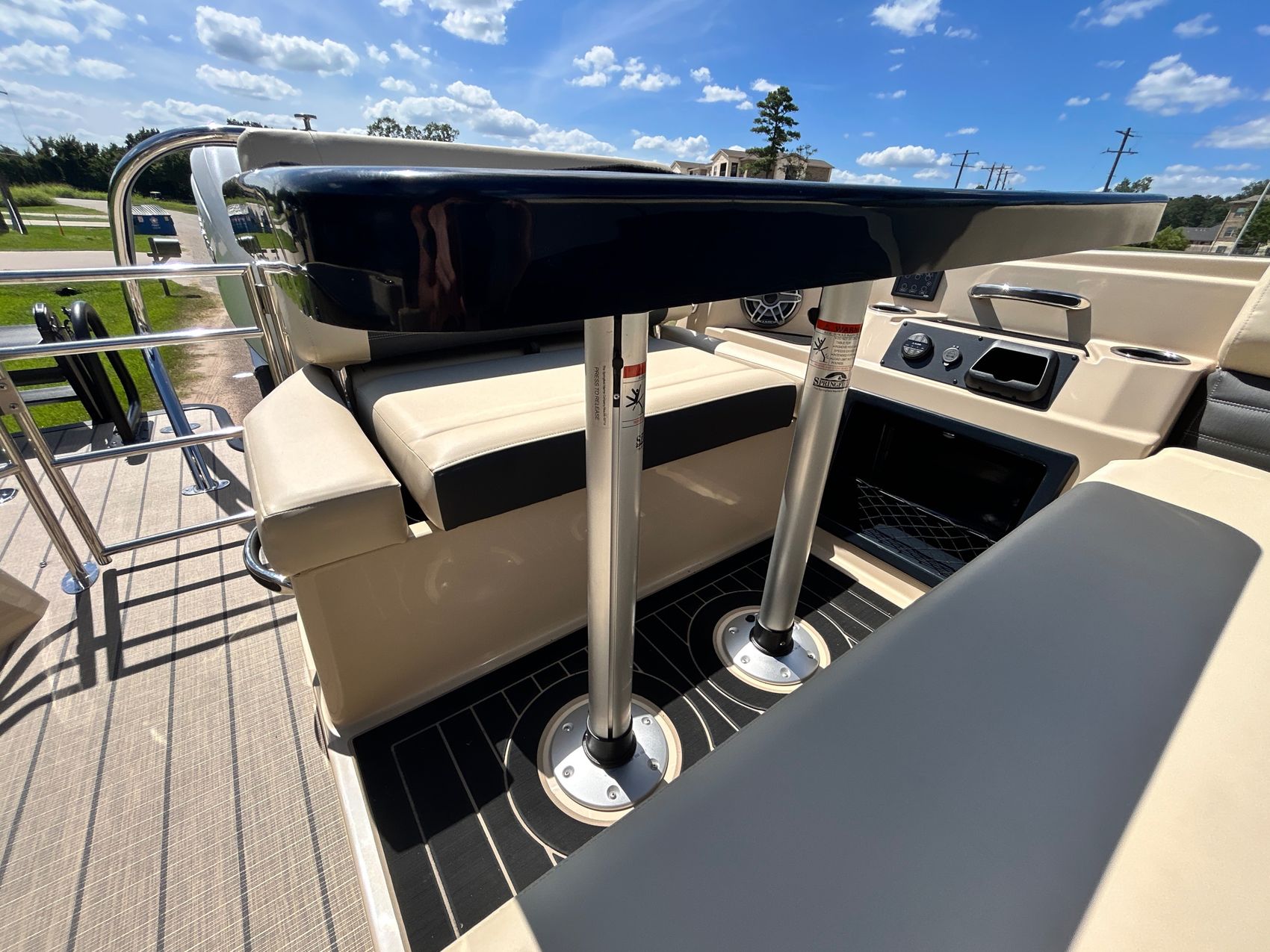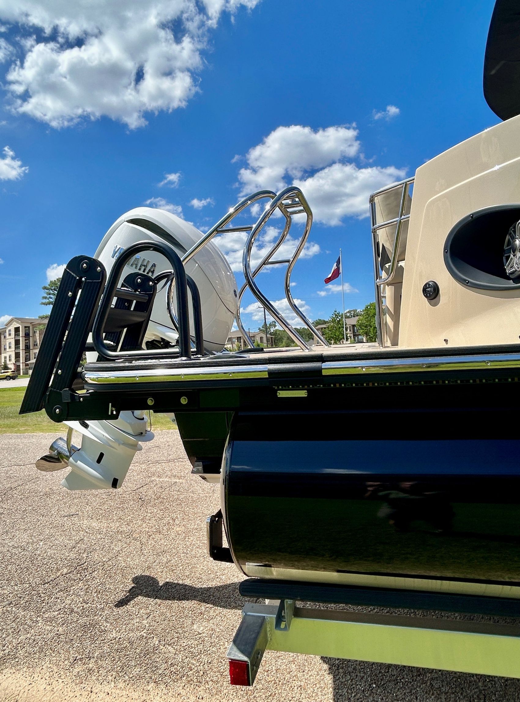 ADDED FEATURES: In-floor Storage, Black Tubes, Battery Charger, Dual Batteries, Custom Cover, Teak Weave Flooring (Tan),Two Bimini Tops (Rear is Powered), Interior Mood Lights (RGB), Furniture Cupholders Lighted (RGB), Underwater Lights & Underdeck Lights (RGB), Deluxe Ski Tow, Dual Glass Windshields, Dual Raised Consoles, Extended Back Deck, Upgraded REVO Black Ladder, Rear Facing Speakers, Ultra Premium Sound Package—Stern Remote