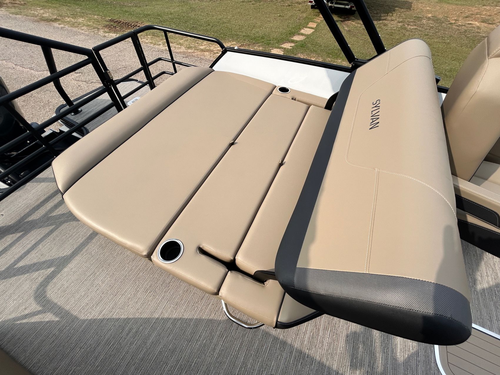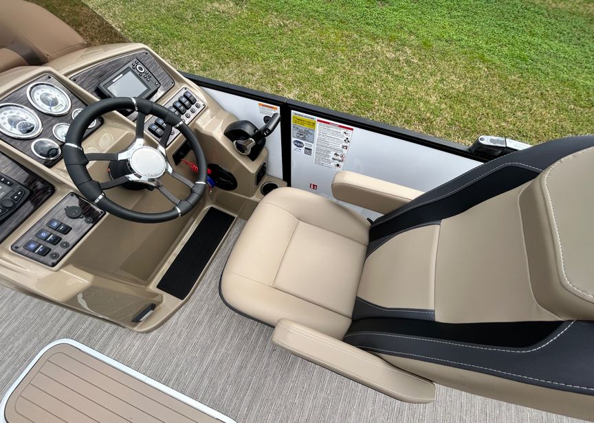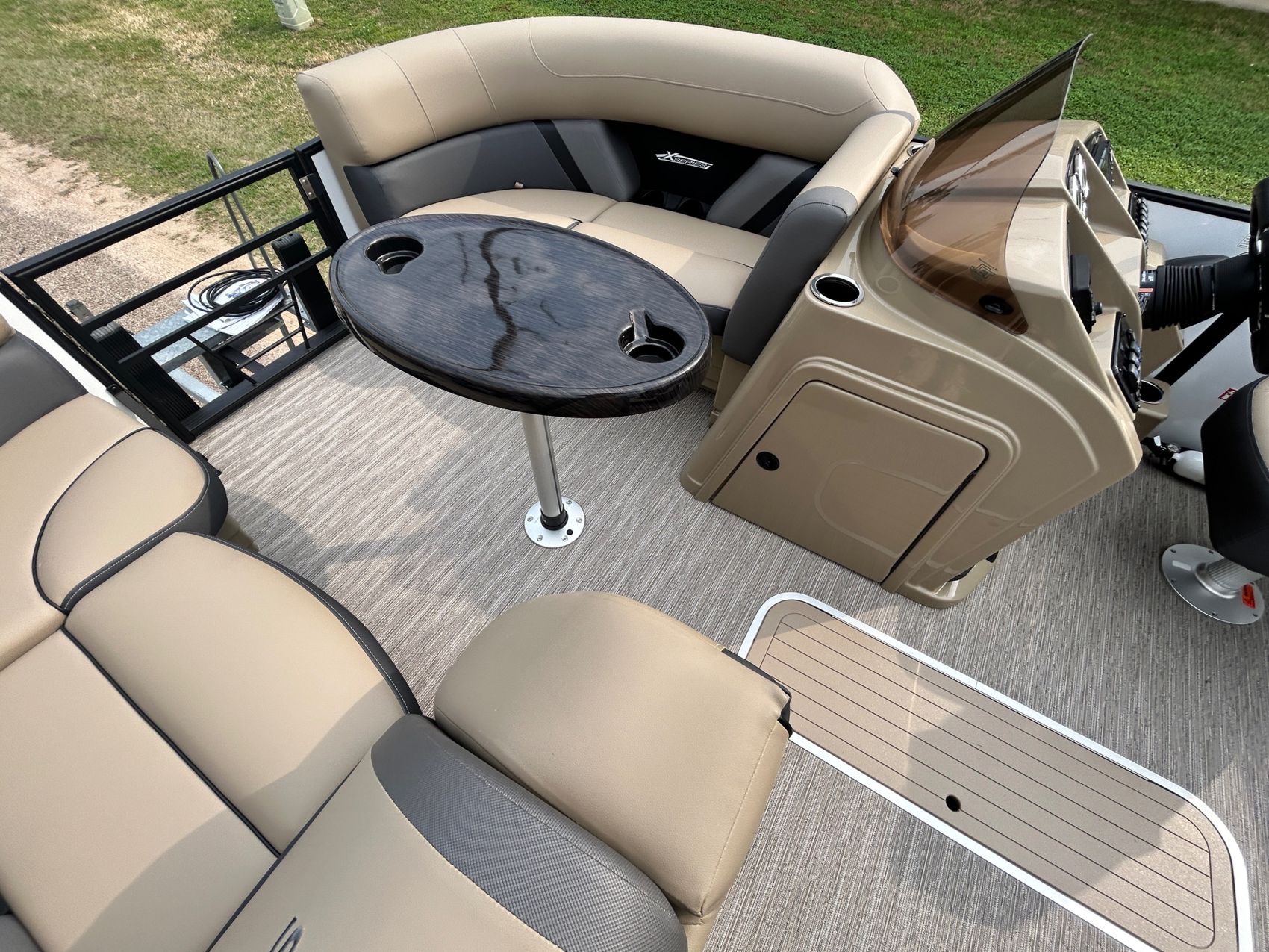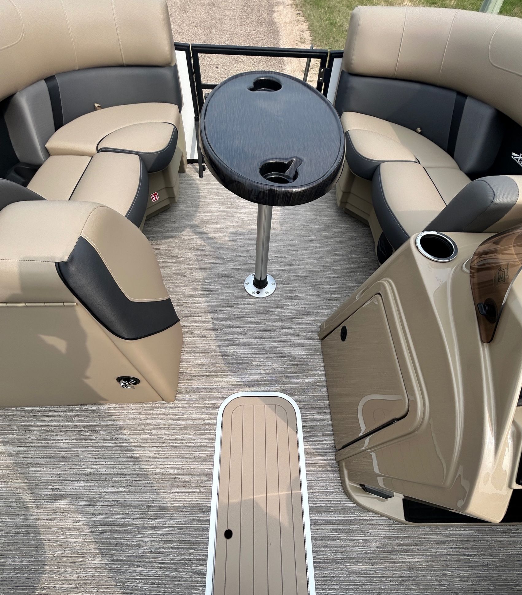 Built with an exceptional load-bearing capacity, this pontoon encompasses a spacious and luxurious layout. The high-end upholstered seats offer supreme comfort, while space-saving features ensure ample room for relaxation, dining and storage for water equipment and gear. For entertaining has a removable table and ski tow for watersports fun.