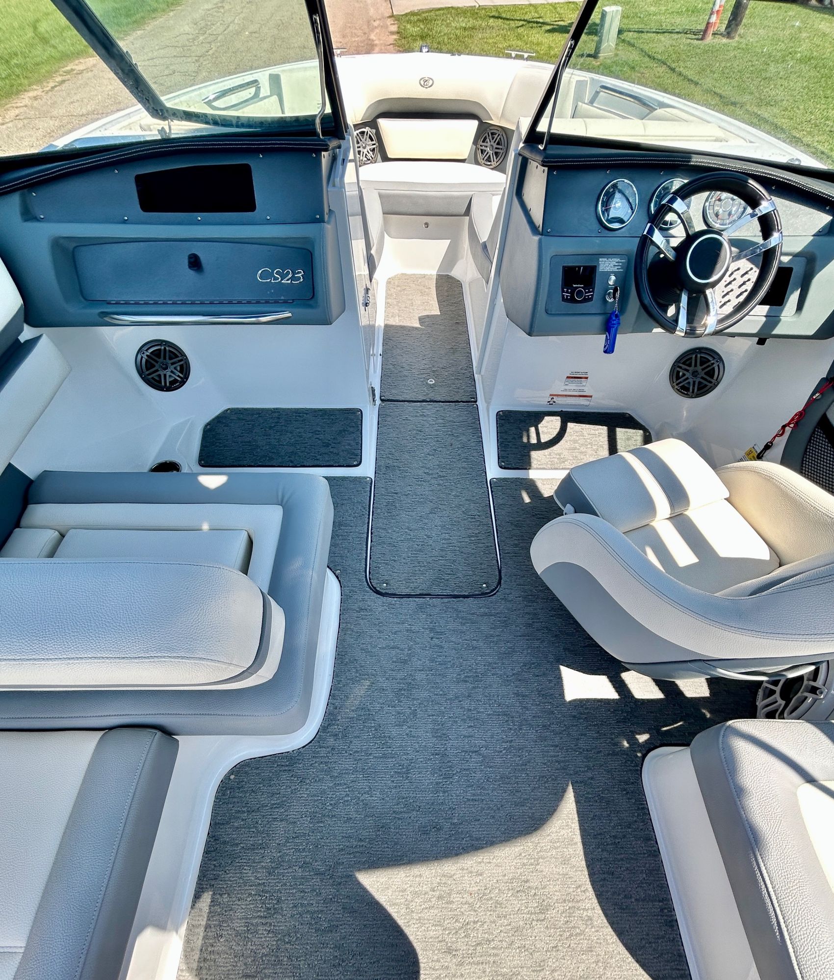 Design: A sparkling representation of Cobalt's commitment to sophisticated design and high-quality construction, the CS23 inaugurates a sleek, streamlined profile, and a spacious deck layout, perfected by warm interior detailing and a mechanically-maximized hull for a smoother ride. The boat is resplendently furnished with contemplated features that promote comfort, functionality, and style.